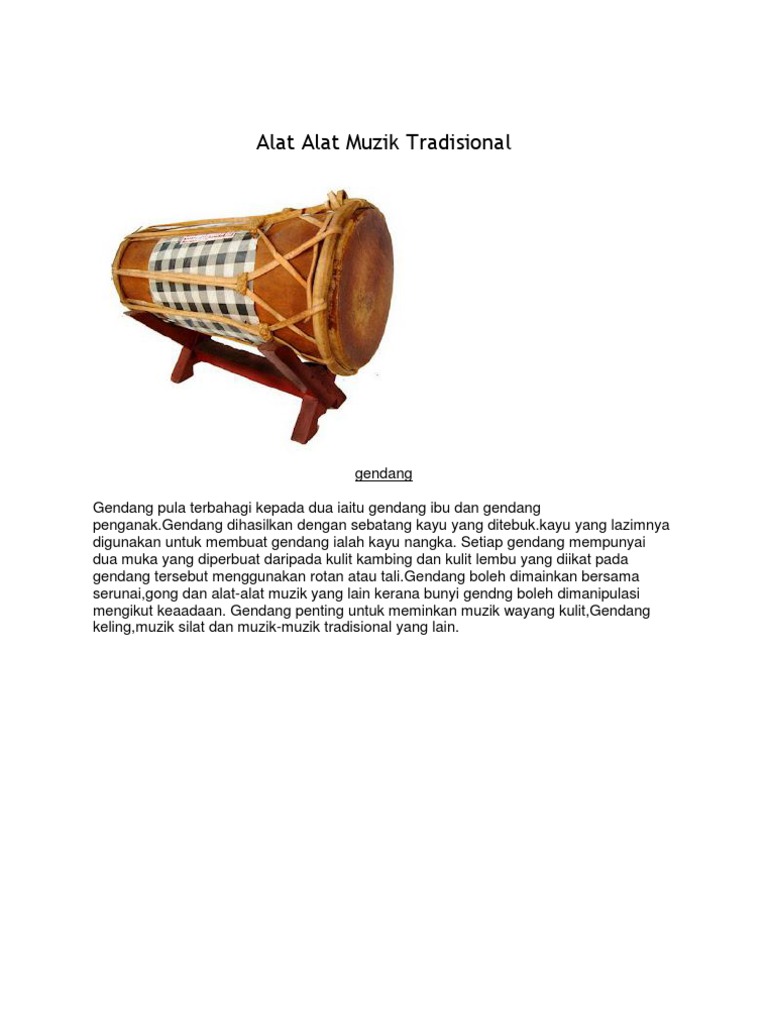 Membranofon Alat Muzik Tradisional Kaum Malaysia from alatmuziktradisionalmalaysia.weebly.com Mulai dari bulat pipih seperti drum, lonjong panjang seperti gendang, hingga ke yang paling besar seperti beduk. Kendang begitu dikenal oleh banyak orang, mulai dari pecinta musik lokal hingga asing atau pun mancanegara. Cara memainkannya cukup mudah yaitu tinggal di tabuh untuk menghasilkan suara menbrafon. Gendang berbentuk tabung kayu asimetris yang menyerupai selongsong. Instrument ini dibunyikan dengan tangan, tanpa alat bantu. Diantara alat musik tradisional indonesia lainnya, mungkin gendanglah yang paling indonesia. Gendang melayu berasal dari kawasan padang panjang yang pasti saja sesungguhnya kental dapat kebiasaan melayu. Untuk memainkan alat musik satu ini cukup dengan cara dipukul.